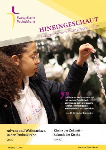 Unsere Gemeindemitglieder erhalten vier- bis fünfmal im Jahr unsere Gemeinde-Nachrichten „hineingeschaut“ mit der Post zugeschickt. Neben Terminen und Kontaktinfos erfahrst Du Wissenswertes aus dem Gemeindeleben, über unsere Nachbarn und Hintergrundberichte über religiöse Themen unserer Zeit.