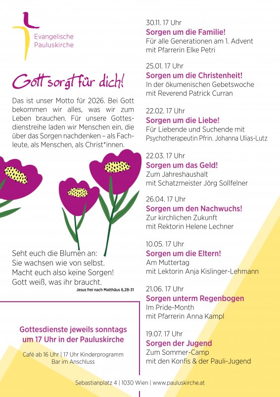 Aktuell leben wir in bewegten Zeiten und viele Menschen machen sich Sorgen über die Zukunft. Blumen sollen uns in der Pauluskirche 2026 ermutigen und an das Jesus-Wort aus dem Matthäusevangelium erinnern: „Wer von euch kann durch Sorgen sein Leben auch nur um einen Tag verlängern? Und warum macht ihr euch Sorgen? Seht, wie die Blumen auf den Feldern wachsen! Macht euch keine Sorgen! Gott weiß, was ihr braucht.“