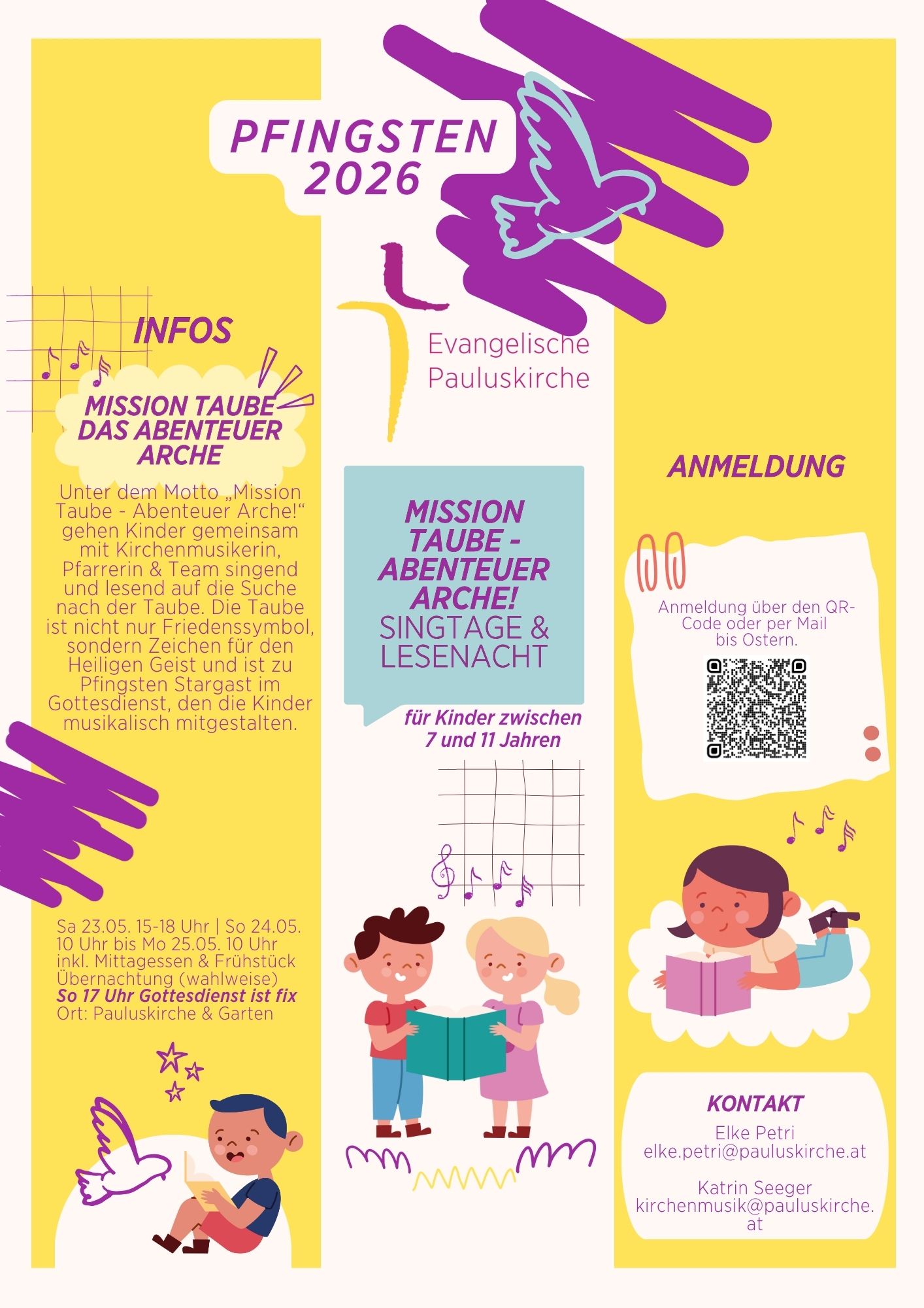 Unter dem Motto „Mission Taube - Das Abenteuer Arche!“ gehen Kinder singend und lesend auf die Suche der Taube, dem Symbol für den Heiligen Geist, der zu Pfingsten Stargast ist.